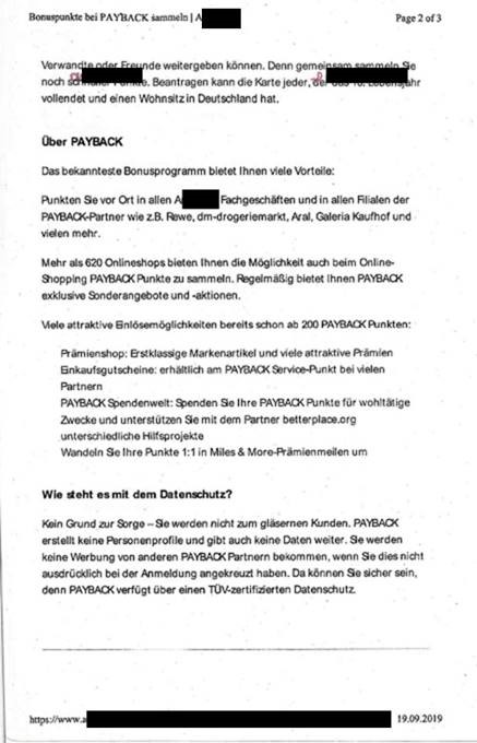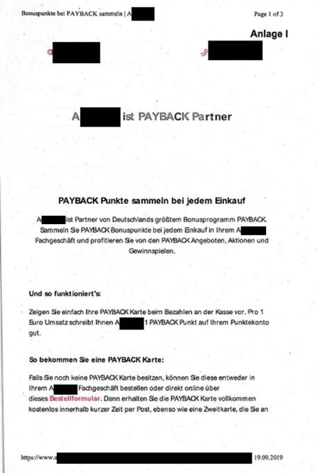 2 Die Beklagte kooperiert mit der PAYBACK GmbH. Bei dem PAYBACK-System handelt es sich um das größte deutsche Bonusprogramm mit über 31 Millionen Kunden, dem über 40 stationäre Partner und über 600 Online-Partner angehören. Kunden, die eine PAYBACK-Karte besitzen und diese an der Kasse beim Bezahlen vorzeigen, bekommen bei der Beklagten pro einem Euro Umsatz einen PAYBACK-Punkt im Wert von einem Cent auf ihrem PAYBACK-Konto gutgeschrieben. Die gesammelten Punkte können bargeldlos von der PAYBACK-GmbH ausgezahlt oder in Sachprämien, Gutscheine, Spenden oder Miles & More-Prämienmeilen umgewandelt werden. Die Beklagte warb am 19. September 2019 auf ihrer Internetseite mit der Gutschrift von PAYBACK-Punkten bei jedem Einkauf und der Umwandlung von PAYBACK-Punkten in Sachprämien, Gutscheine, Spenden oder Miles & More-Prämienmeilen wie aus Anlage I ersichtlich: